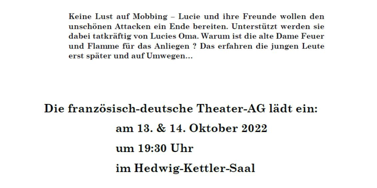 Die französisch-deutsche Theater-AG präsentiert ihre neue Produktion: „Notre pari?! PARIS!!!“ Am Donnerstag, 13.10.2002, und Freitag, 14.10.2022, jeweils um 19:30 Uhr im Hedwig-Kettler-Saal in der Sophienstraße 2. Alle sind herzlichst eingeladen, Vorkenntnisse nicht erforderlich – wir spielen in zwei Sprachen.