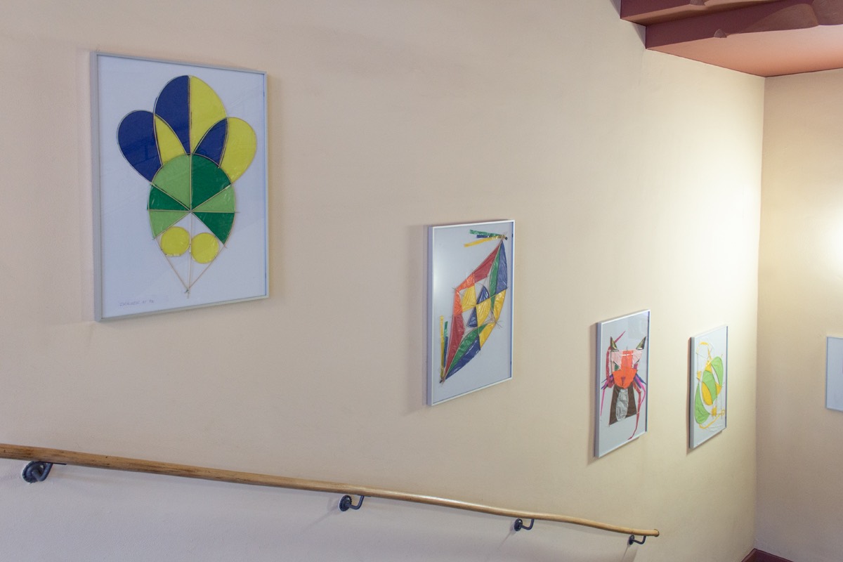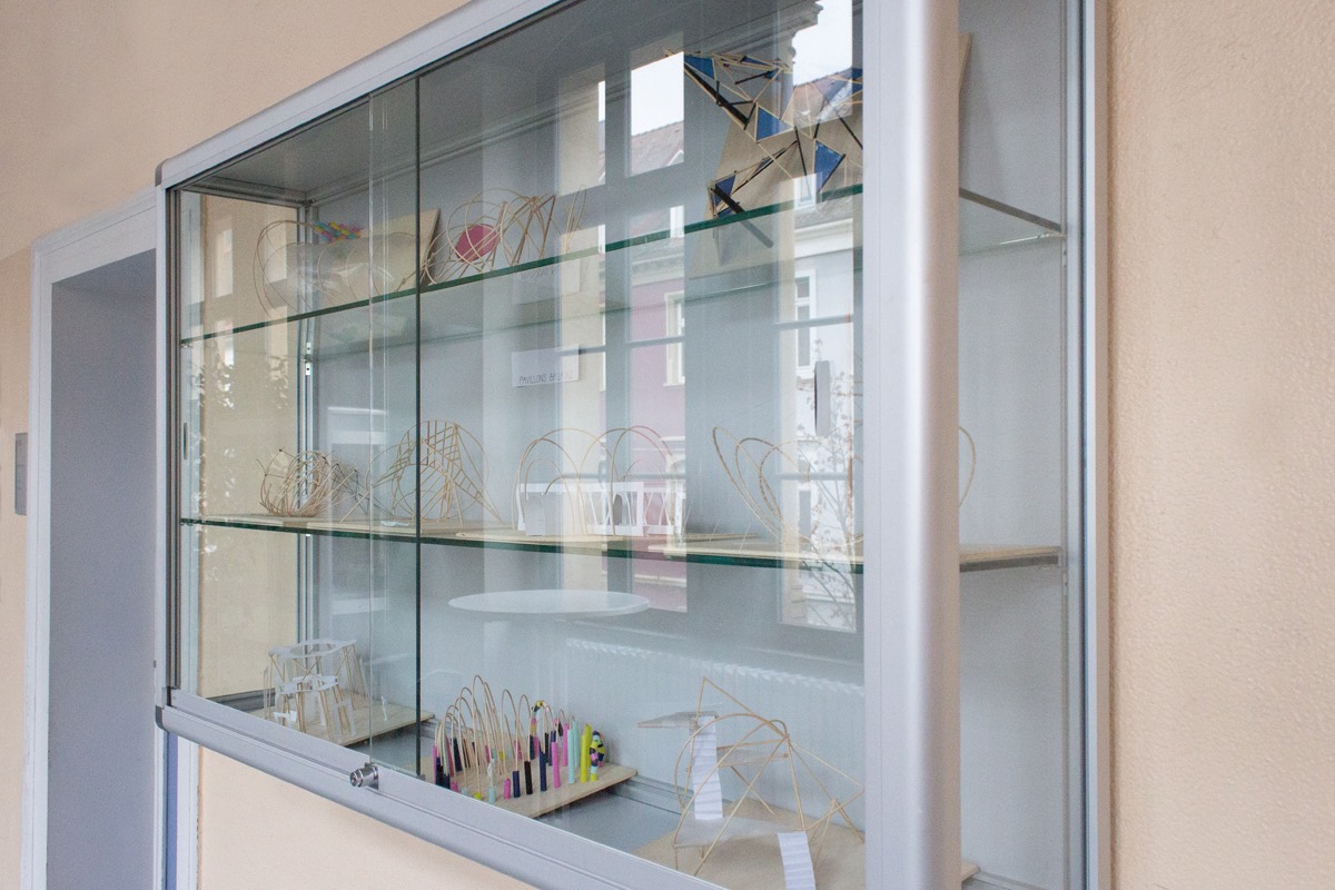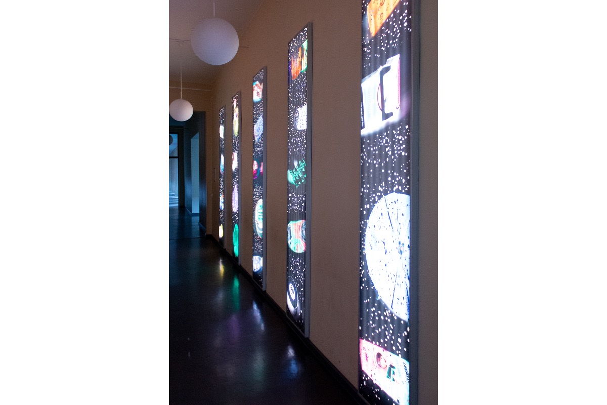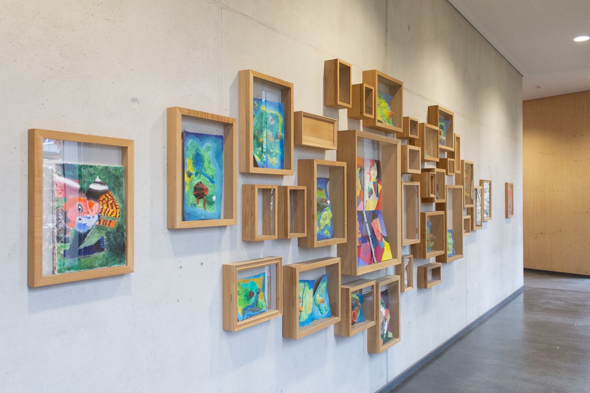 An vielen Orten im Schulhaus gibt es ständig wechselnde Präsentationen der Schülerarbeiten. Hierfür stehen eine Vielzahl an Bilderrahmen und Vitrinen bereit. Es gibt sogar eine Leuchtwandinstallation, die gestaltet werden kann.