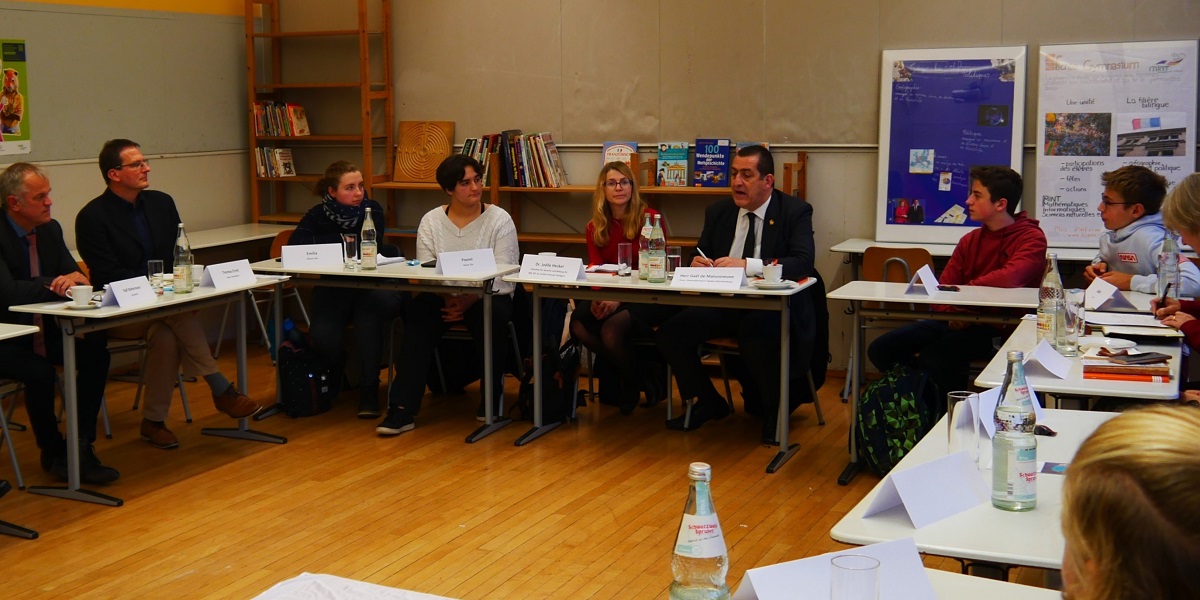 In einer ersten Runde standen die Schulleitung, Herr Wehrmann und Herr Ernst, für ein Gespräch zur Verfügung, gemeinsam mit Vertreterinnen der bilingual unterrichteten Sachfächer: für Geschichte Frau Lunkenheimer, für Gemeinschaftskunde Frau Raab sowie für Geographie in Personalunion mit dem Vorsitz der Französischfachschaft Frau Lanske. Außerdem war mit dabei Frau Göbeler von unserem Kooperationspartner Centre culturel, wo der Generalkonsul im Anschluss einen Termin hatte. Unsere Französischreferendarin Frau Hopf vertrat die künftigen Französischlehrkräfte und übernahm darüber hinaus die Pressearbeit, indem sie das Treffen mit der Kamera in der Hand dokumentierte.