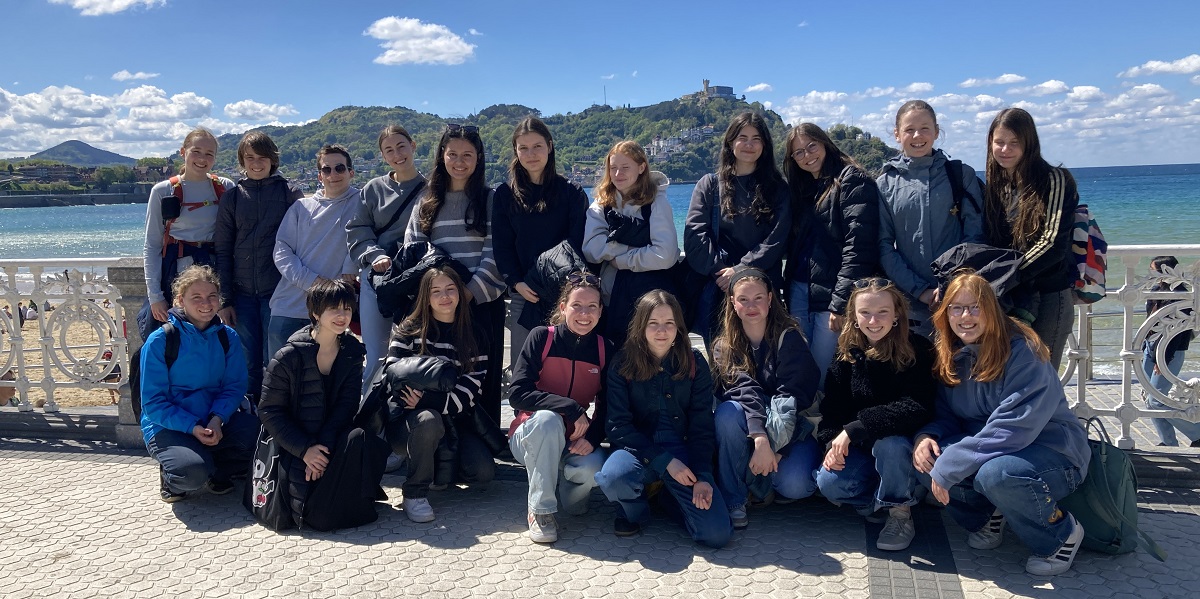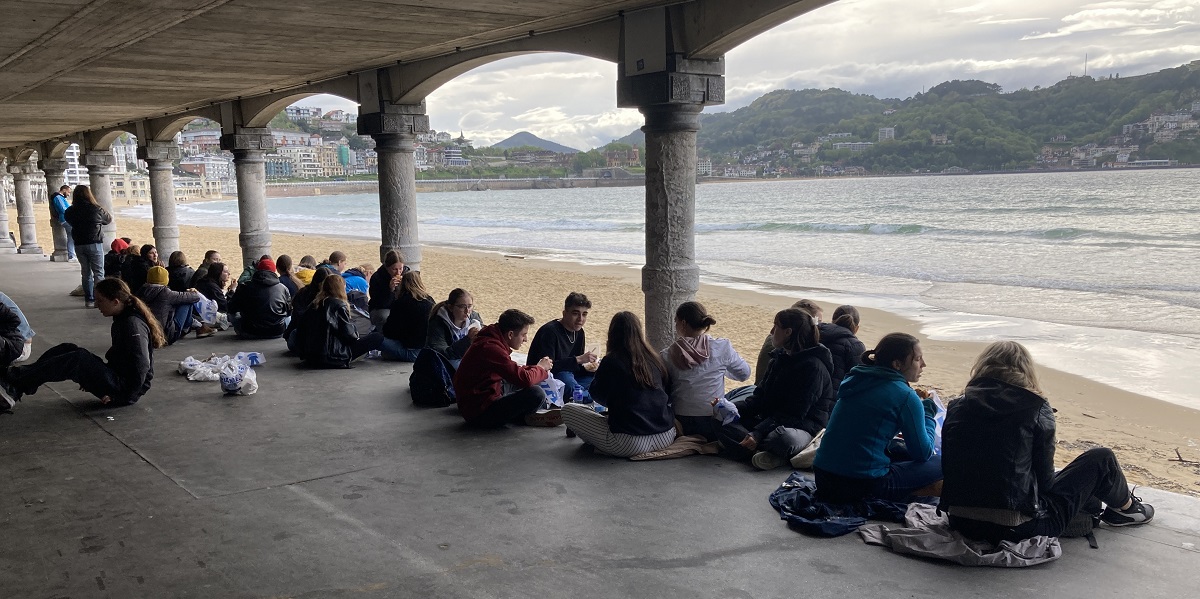 Vom 21. bis 26. April 2024 fuhren 40 Schülerinnen und Schüler der Spanischklassen 9 und 10 zusammen mit Frau Förster, Frau Iglesias und Frau Bierlein für sechs Tage in die spanische Stadt San Sebastián (Donostia - San Sebastián) nahe der französischen Grenze. Am Sonntagmorgen um 8 Uhr ging es mit dem Zug vom Karlsruher Hauptbahnhof nach Spanien. Nach einem kurzen Zwischenstopp in Paris kamen wir nach insgesamt neun Stunden Fahrt leicht erschöpft, aber umso glücklicher in San Sebastián an.