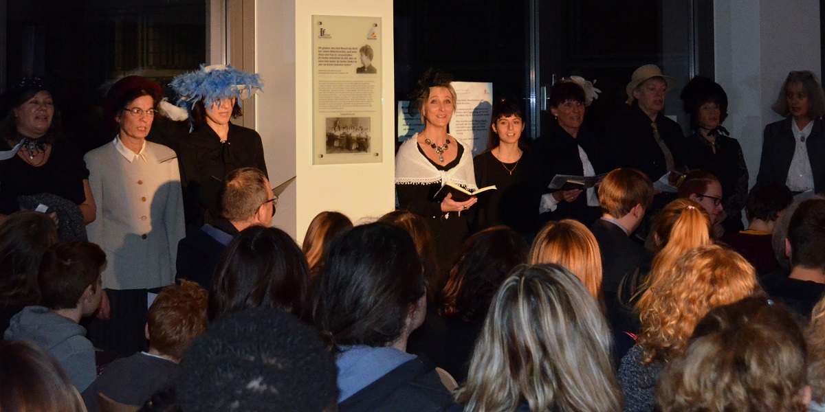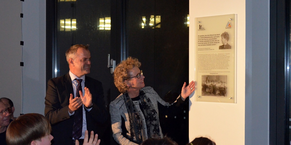 Bei dieser Gelegenheit wurde unser Veranstaltungsraum in der Sophienstraße 2 in Gedenken an die Pionierin der Mädchenbildung, Hedwig Kettler, in Hedwig-Kettler-Saal umbenannt. Zu Ehren der deutschen Frauenrechtlerin enthüllte Frau Dr. Susanne Asche, Leiterin des Kulturamtes Karlsruhe, an der Seite von Herrn Wehrmann die Gedenktafel.